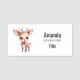 A name tag with an illustration of an adorable baby deer. Big eyes big ears with a large head and little brown antlers. Wearing a big red bow.