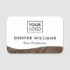 Balise de nom blanche et élégante avec votre nom, titre et logo personnalisé. Le long du fond est une bordure courbée brune, à l'aspect bois (image imprimée). Vous pouvez modifier les polices et les couleurs de police, déplacer et redimensionner le logo et d'autres éléments à l'aide de l'outil de conception.