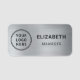 Nom professionnel avec le logo de votre entreprise ou de votre organisation contre un faux arrière - plan métallique en argent. Ajoutez un nom et un titre/une position dans une simple typographie.