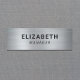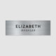 Étiquette nominative moderne avec un nom et un titre en typographie simple sur un fond métallisé argenté faux.