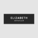 Simple étiquette de nom noir avec un nom d'employé et un titre dans la typographie blanche moderne.