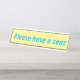 Ce design simple et basique comporte le message "S'il vous plaît, prenez place". Cela pourrait être utilisé dans un salon d'attente pour informer les patients, les visiteurs ou les clients qu'ils seront accueillis sous peu et qu'ils devraient prendre place entre-temps.
