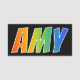Cet amusement, caractéristiques de conception nommées vibrantes et multicolores d'étiquette le prénom commun "AMY", avec les lettres du nom ayant un spectre coloré d'arc-en-ciel comme le motif de coloration de gradient, sur un arrière - plan coloré par noir. Un nametag comme ceci pourrait être porté par un membre du personnel, un technicien, ou un employé qui est appelé Amy, pour aider à identifier le porteur à d'autres. [~Z0000344]
