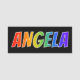 Cet amusement, caractéristiques de conception nommées vibrantes et multicolores d'étiquette le prénom commun "ANGELA", avec les lettres du nom ayant un spectre coloré d'arc-en-ciel comme le motif de coloration de gradient, sur un arrière - plan coloré par noir. Un nametag comme ceci pourrait être porté par un employé, un technicien, ou un membre du personnel qui est appelé Angela, pour aider à identifier le porteur à d'autres. [~Z0000344]
