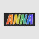 Cet amusement, caractéristiques de conception nommées vibrantes et multicolores d'étiquette le prénom commun "ANNA", avec les lettres du nom ayant un spectre coloré d'arc-en-ciel comme le motif de coloration de gradient, sur un arrière - plan coloré par noir. Un nametag comme ceci pourrait être porté par un volontaire, un technicien, ou un employé dont le nom est Anna, pour aider à identifier le porteur à d'autres. [~Z0000344]