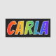 Cet amusement, caractéristiques de conception nommées vibrantes et multicolores d'étiquette le prénom commun "CARLA", avec les lettres du nom ayant un spectre coloré d'arc-en-ciel comme le motif de coloration de gradient, sur un arrière - plan coloré par noir. Un nametag comme ceci pourrait être porté par un volontaire, un technicien, ou un employé dont le nom est Carla, pour aider à identifier le porteur à d'autres. [~Z0000344]