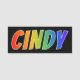 Cet amusement, caractéristiques de conception nommées vibrantes et multicolores d'étiquette le prénom commun "CINDY", avec les lettres du nom ayant un spectre coloré d'arc-en-ciel comme le motif de coloration de gradient, sur un arrière - plan coloré par noir. Un nametag comme ceci pourrait être porté par un volontaire, un employé, ou un membre du personnel qui est appelé Cindy, pour aider à identifier le porteur aux clients ou à d'autres personnes. [~Z0000344]