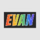 Cet amusement, caractéristiques de conception nommées vibrantes et multicolores d'étiquette le prénom commun "EVAN", avec les lettres du nom ayant un spectre coloré d'arc-en-ciel comme le motif de coloration de gradient, sur un arrière - plan coloré par noir. Un nametag comme ceci pourrait être porté par un volontaire, un employé, ou un membre du personnel dont le nom donné est Evan, pour aider à identifier le porteur à d'autres. [~Z0000344]