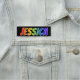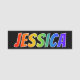 Cet amusement, caractéristiques de conception nommées vibrantes et multicolores d'étiquette le prénom commun "JESSICA", avec les lettres du nom ayant un spectre coloré d'arc-en-ciel comme le motif de coloration de gradient, sur un arrière - plan coloré par noir. Un nametag comme ceci pourrait être porté par un employé, un membre du personnel, ou un technicien dont le nom est Jessica, pour aider à identifier le porteur à d'autres. [~Z0000344]