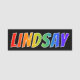Ce design amusant, vibrant, multicolore de marque de nom comprend le prénom commun "LINDSAY", avec les lettres du nom ayant un spectre arc-en-ciel coloré comme motif de couleur dégradé, sur un arrière - plan de couleur noire. Un tel nom peut être porté par un membre du personnel, un bénévole ou un employé qui s'appelle Lindsay, pour aider à identifier le porteur. [~Z0000344]