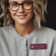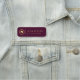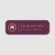 This real estate name tag features a faux gold house logo framed by a circular Greek key motif on the left and simple, gold-colored sans serif text on the right, with a vertical line between, on a burgundy background.