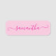 Une signature moderne mignonne de petite ceinture enroulée avec queues décoratives contre un arrière - plan de couleur solide rose clair personnalisable. Vous pouvez modifier la couleur de la police et laisser tomber l'ombre. Conservez les symboles au début et à la fin de votre nom pour créer les swashes. Créez vos propres étiquettes de nom pour le bureau.