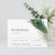 Un ensemble minimal mais magnifique de cartes de réponse de mariage comprenant une élégante plume de paon au-dessus de vos informations et détails de mariage.