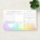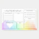 Notes pratiques pour votre planification personnelle quotidienne avec un lavage à l'aquarelle dans une palette arc-en-ciel allant du violet au bleu au vert en passant par le jaune et le rouge. Écrivez les choses pour être reconnaissant, gardez une trace de la quantité d'eau que vous buvez, combien de fois vous avez étiré tout au long de la journée, et votre nombre de pas. Joignez une affirmation pour la journée, écrivez vos repas et ajoutez une liste de choses à faire. Il y a aussi de la place pour ajouter des notes ou des choses à retenir. Personnalisez avec votre nom dans un joli script.