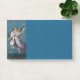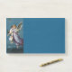avec des villes et une rivière à l'horizon, un bel ange dans une robe mauve avec un ruban rose vole dans le ciel en tenant un enfant. peinture de style renaissance en bleu, mauve et blanc. la jolie ange pointe vers la ville en dessous tandis qu'elle flotte au-dessus en tenant un bébé enveloppé dans une couverture. la lune de nuit brille d'une lumière douce sur l'ange coloré.