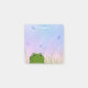 Une mignonne grenouille aux yeux grands regarde à travers une herbe haute et agitée dans un champ sur ce carnet amusant. De jolies libellules de tailles variées volent au-dessus de la tête de la grenouille contre un ciel bleu / rose - personnalisez avec son nom - par katz_d_zynes