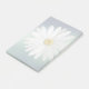 A serene photo of a single delicate with daisy. Soft dainty white petals with a bright yellow center. Le Background c'est le misty greenish blue color.