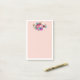 Floral postit note avec vos initiales en lettres blanches modernes au-dessus d'un bouquet de fleurs colorées et de verdure en rose et violet et bleu contre un arrière - plan rose vif.