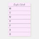 Le plan vos tâches et engagements plus importants des lundi à dimanche avec un planner/to hebdomadaire rose-clair énumèrent avec votre nom au dessus dans une police noire de manuscrit. Les jours de la semaine sont divisés en égal - rangées classées avec la première lettre de chaque jour du côté gauche. Customisez-le avec votre nom ou texte dans la barre latérale.