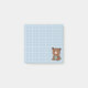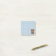 Dessin d'un ours en peluche marron, adorable, mignon, joyeux, il a un petit sourire et des joues roses et un timbre à motif bleu et blanc sur le ventre. L'arrière - plan est bleu avec un motif en grille blanche.