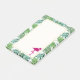 Des notes collantes avec un motif feuille tropical vert et un cadre blanc avec une bordure dorée superposée. Une illustration de flamand rose apporte une touche de fantaisie.