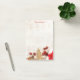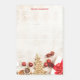 Des notes collantes avec une photo rustique. Une planche en bois marron clair avec différents éléments de Noël au fond.