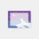 Un ourson blanc arctique aux yeux bleu vif, assis sur la neige, regardant la lune du croissant, et des étoiles dans le ciel vierge violet au-dessus des eaux bleues glacées. Art animal original par Alicia Marie.