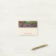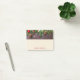 Des notes collantes avec une photo rustique d'une table en bois marron avec des pinecones, des aiguilles de pin, de la neige et des ornements de Noël. Festif et adorable.