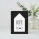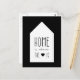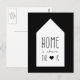 Carte postale inspirante affichant l'expression "La maison est là où le coeur est" en noir contre un arrière - plan blanc en forme de maison.