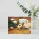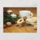 Un elfe de maïs qui mange un biscuit de Noël sur la table à côté de la cheminée de l'avent - Joyeuse carte de Noël ou carte postale