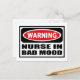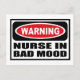Avertissement INFIRMIÈRE MAUVAISE HUMEUR Carte postale que vous pouvez personnaliser sur www.WarningSignShirts.com et qui présente un panneau d'avertissement rouge et noir et INFIRMIÈRE MAUVAISE HUMEUR en lettres noires grasses pour avertir le monde. Vous pouvez également personnaliser votre propre carte postale de panneau d'avertissement avec le texte de votre choix.