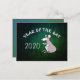 Illustration mignonne d'un rat dans le style de la bande dessinée avec 2020 et "Année du Rat" à personnaliser si vous le souhaitez sur une image métallique verte en arrière-plan. Conception sur carte postale horizontale. Carte de vœux assortie, produits artisanaux et plus...