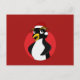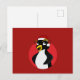 Carte postale avec illustration d'un mignon pingouin crêpé avec chapeau de Père Noël rouge ; dessin animé de Noël pour les enfants, sur un arrière - plan rouge