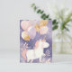 Carte d'anniversaire aquarelle charmante représentant une licorne blanche joyeuse avec une crinière rose et une corne dorée, marchant gracieusement tout en portant des ballons roses, violets et dorés sur un fond étoilé de rêve. Parfait pour les anniversaires d'enfants, les amateurs de licorne et les célébrations magiques.