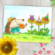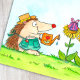 Un petit hérisson déguisé en jardinier a arrosé ses tournesols et a découvert un cadeau, un gâteau d'anniversaire et un chapeau de fête pour lui.