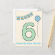 Nouvelle carte de vœux d'anniversaire pour un enfant de six ans, comportant un grand chiffre 6 vert, un fond bleu à pois blancs et une guirlande verte et sarcéne colorée, ainsi qu'un doux vœu "Joyeux Anniversaire !".