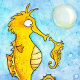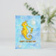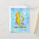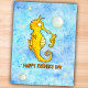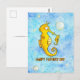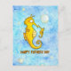 Le fond de cette carte est fait de deux nuances de bleu différentes, alternant pour former un fond harmonieux à l'aquarelle. Çà et là, des bulles d'air montent lentement vers la surface. Au premier plan, il y a deux hippocampes jaunes, un petit et un plus grand. Ils se sourient l'un à l'autre. Le plus grand est le père. Chez les hippocampes, c'est le mâle qui a une poche sur le ventre, qui donne naissance et qui porte les bébés. Sous les deux hippocampes est écrit "Joyeuse Fête des Pères" en lettres orange manuscrites.
