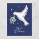 Carte postale de vacances illustrant une belle colombe blanche tenant une branche d'olivier. Arrière - plan bleu foncé aux étoiles blanches et le texte "Paix" sous la colombe.