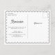 Conçu pour se coordonner avec notre collection Scalloped Border, cette carte de rappel de RSVP minimaliste présente un design classique avec une touche unique - la bordure en feston est unique en son genre, et ajoutera certainement une touche rétro à cette invitation moderne. Si vous voulez attirer l'attention de vos invités avec ce design unique, cette suite est parfaite pour vous. Pour une personnalisation plus avancée de ce design, par exemple en changeant la mise en page, la police ou la taille du texte, veuillez cliquer sur le bouton "PERSONNALISER" ci-dessus. N'hésitez pas à me contacter pour toute question !
