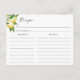 Collectionnez vos recettes de cuisine préférées avec cette carte de recette de mariage sur le thème du citron de Redwood & Vine Design Co. Avec des citrons aquarelle et un script élégant, cette carte éditable est parfaite pour les mariages, les échanges de recettes et les livres de cuisine souvenirs. Un ajout attentionné pour les événements sur le thème des agrumes ou du « main squeeze ».