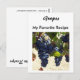 Carte Recette - Raisins. Image de grappes de raisins sur la vigne. Intitulé "Raisins" Personnalisez le titre de la recette "Ma recette préférée" une fois et il apparaîtra à l'avant et à l'arrière. Écrivez ou collez votre recette pour un plat préféré au dos.