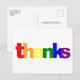 Envoyez à quelqu'un un mot de remerciement joyeux et coloré. Cette carte postale présente le mot "merci" dans une typographie grasse. Chaque lettre est colorée comme le drapeau arc-en-ciel de la fierté et est placée sur un fond blanc simple. Le verso est personnalisé avec votre adresse de retour.