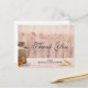 Une carte de remerciement pour mariage ou autre. Conçue avec un thème rustique de campagne. Un vieux bidon de lait rouillé avec une jolie fleur jaune à ses côtés. Du blé et des fleurs roses délavées en arrière-plan sur un panneau de bois légèrement visible.