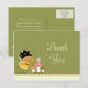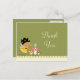 Cette carte de remerciement d'anniversaire de fille adorable a un thème de fée. Il y a une fée afro-américaine qui vole avec une baguette à fleurs à côté de champignons avec une petite souris sur le dessus. Le fond est d'une couleur vert olive avec des pois. Le bas a un bord festonné de couleur crème avec une bande rose. Copyright © Zenware Designs