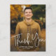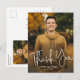 Une carte de remerciement de fin d'études simple en écriture moderne avec une photo en portrait plein cadre et police manuscrite sur le devant avec le nom et les détails de la remise des diplômes. Le dos comporte une deuxième photo avec un message de remerciement du diplômé. Cliquez sur le bouton modifier pour personnaliser ce design.
