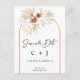 Carte postale moderne et minimaliste pour sauver notre date, avec une arche en terre cuite et un arrangement floral sec avec des roses orange brûlées, des vergers blancs et des feuilles de palmier. Ce design présente également les initiales du couple, un titre d'image calligraphique moderne et le dos est préparé pour l'adresse et le message du couple.