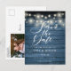 Cette carte de save the date rustique présente de jolies guirlandes lumineuses et un élégant script save the date au-dessus de vos détails présentés dans une typographie élégante sur un fond en planches de bois bleu rustique. Le verso présente votre photo spéciale et contient des détails supplémentaires sur le save the date, y compris votre site web de mariage, avec votre adresse de retour et un espace pour l'adresse de votre destinataire. Conçu par Thisisnotme©