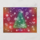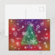 Une dispersion de flocons de neige blancs, de feuilles et de baies de houx, d'étoiles et de pins sur un fond lumineux de rouge, d'orange, d'or et de pourpre, avec une forme de sapin de Noël vert tendre au milieu.