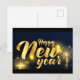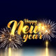 Texte doré de Bonne Année avec feux d'artifice et fond bleu foncé, célébration festive, conception de carte postale, typographie élégante, pour la saison des fêtes.