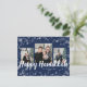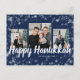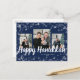 Carte de vœux élégante pour Hanukkah. Cette carte de vœux élégante présente un cadre festif recouvert de flocons de neige blancs avec du texte blanc sur fond bleu marine avec un collage de 3 images. Le verso comprend une 4e photo et du texte supplémentaire pour personnaliser.